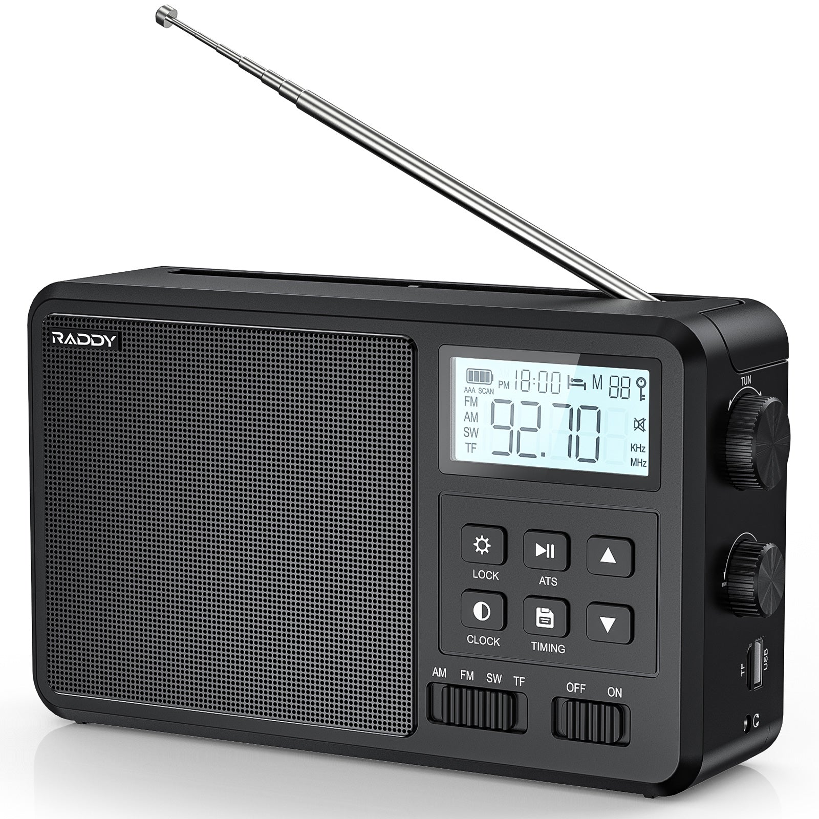The Raddy RF206 offers exceptional value for the money with good performance overall. It covers AM from 520 to 1710 KHz with 10K/9K tuning steps, FM from 64 – 108 MHz and SW from 2.3 to 23 MHz. It runs in 4 AA cells or built-in AC power (no external adapter needed), and although my radio is marked 100 – 110 Volts Raddy has assured me it is compatible with the normal 120 volts found in the US today. It can play audio from Tiff cards or USB sticks. It supports TF cards with a maximum capacity of 256GB and can play WMA, WAV, APE, FLAC and MP3 formats. In Bluetooth/TF/USB music playback modes, you can pause playback, fast forward or rewind, and select the previous or next song. Audio is strong and clear plus there is a 3.5MM headphone jack, an external antenna jack for SW and a fold-down carrying handle.