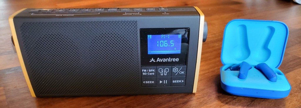 Recently a reader suggested that I check out the Avantree Soundbyte T Streaming Radio because it has one unusual feature…it can not only act as a Bluetooth speaker as many modern radios do but it can also transmit via Bluetooth to a pair of supplied earbuds, and this seemed like an exciting feature to try out. Actually, it can transmit to any Bluetooth earbuds or other devices you may have. I was interested in this because I often use an earbud-style radio when I do my yard work and I use noise blocking earbuds to also shield me from the loud noise of my lawnmower whose motor sits right behind me. And although this works well that earbud cable often gets caught on things as I work so it seemed that wireless buds might be a great solution. A google search of “radio to Bluetooth earbuds” found a few other radios with this feature but the Avantree seems to be the most ambitious…I may test a few other smaller ones in the future.