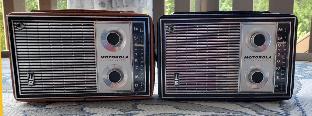 The Motorola X31A/X31N Ranger were introduced in 1961 or 1962, the later X31A-1 (Gray), X31B-1 (Blue), X31E-1 (Black) and X31N-1 (Ginger) arrived in 1962. I have two of the -1 versions which dropped the Ranger name but were upgraded with an external antenna connector. They are 8-transistor designs featuring a tuned RF stage, three gang air variable tuning condenser and a decent-sized 5 1/4” ferrite rod antenna for potentially excellent performance. They include a unique leather cover which can snap on the front for protection during transit or placed on the back for convenient storage…pretty cool. Originally retailing for $49.95 they may have sometimes sold for as low as $35 or so. Neither worked as received so I had to get them playing before I could evaluate them.