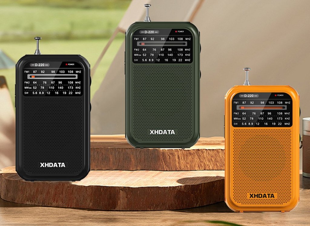The XHDATA D-220 is a no-frills compact AM/FM/SW portable radio measuring 2.8″L x 1.1″W x 4.9″H. It is available in three colors: Black, Orange and Green and features a slide rule dial, frequency coverage of AM: 520 – 1730 KHz, FM 1: 64 – 108 MHz, FM 2: 87 – 108 MHz and SW: 5.6 – 22 MHz. The D-220 tunes AM in 1 KHz steps so it can properly tune to stations in all countries using either 10 KHz or 9 KHz channel spacing. It runs on two AA batteries, there is a flip out back stand, lanyard carrying strap and a stereo earphone jack so even though there is no FM stereo you will hear sound on both sides of stereo earbuds. It is currently selling on Amazon for $15.98.