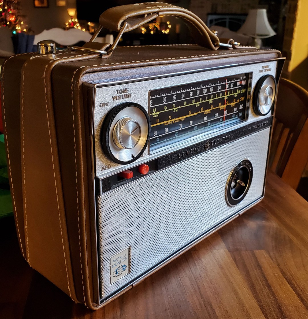 The GE P-990A was sold between 1964 and 1967, priced at $125 and is yet another fine example of heavy-duty, old-school design, featuring a massive steel chassis housed in a beautiful two-tone leather covered cabinet. It is simply beautiful to look at with an attractive multi-colored dial scale, another heavy radio from the time when weight meant quality and this GE is no exception. According to its designer, Conrad Jutson (who also was responsible for the popular P-780 series and several other projects), the P-990 World Monitor was GE’s answer to the Zenith Trans-oceanic but was designed to sell at a much lower price. We’ll take a close look to see how well they achieved their goal.