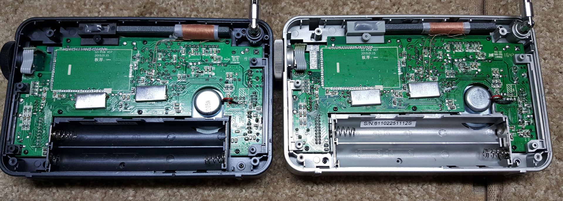 Next I took the backs off of them and found they are indeed the same radio. At least, they have the same circuit board number and revision date. While I can’t say for certain that there aren’t some tiny changes somewhere, I couldn’t see anything different and again, performance is identical. The pictures give pretty good detail for you to compare for yourself.