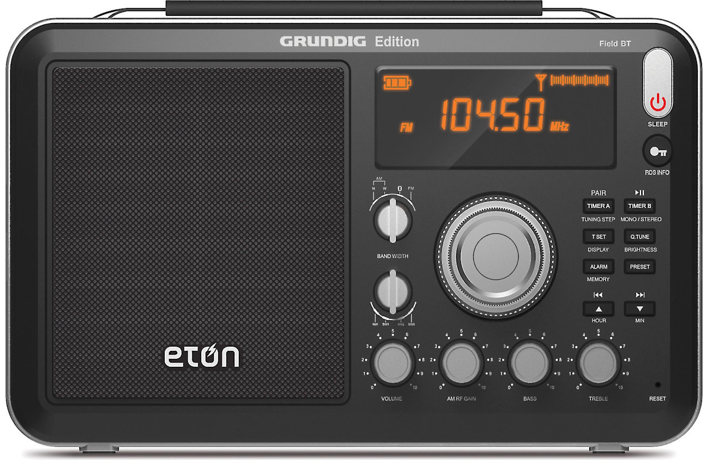The basic functions and control layout are virtually the same as the older Field BT. In a nutshell, the Eton Field BT is a lunchbox-sized DSP (Digital Signal Processing) portable radio (a so-called Field Radio) which runs on 4 D cells or an included Wall Wart AC power supply. It covers standard AM/FM/SW bands and can act as a Bluetooth speaker. It features RDS on FM and FM Stereo at the Headphone and Line Outputs. Many on-line sources currently sell it at $129.99 and I have seen it even higher but it is generally available for just under $100 at Amazon and recently was as low as $79 so watch for price fluctuations. The introduction of a dramatically-improved hi-tech speaker and the addition of Bluetooth capability are the biggest changes over the previous Field 550. This new speaker provides a much fuller, richer sound quality than the older model. In addition, the display is brighter and easier to see in varying lighting conditions.