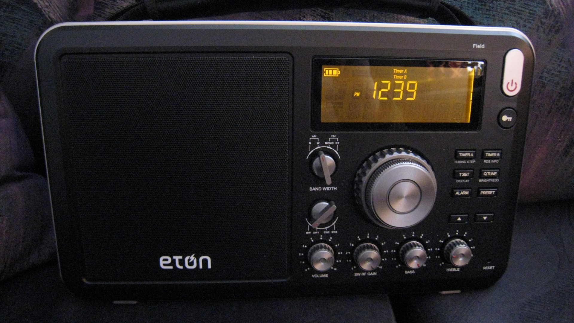 Getting To Know The Field 550: Operation of the radio is straight-forward with few surprises. As is becoming the norm with today’s radios there are a few multi-function buttons which do different things with power on than they do with power off. For example, with the radio on, a short press of the TIMER A/TUNING STEP button changes tuning speed from Fast To Slow to Lock. Similarly, with the radio off, press the Q. TUNE button to toggle the display brightness from low to medium to high. The backlight will go to sleep after 10 seconds while the radio is playing. To keep the backlight always-on slide the BACKLIGHT switch on the side of the radio to the “ON” setting. Be sure to turn it off when done using the radio.