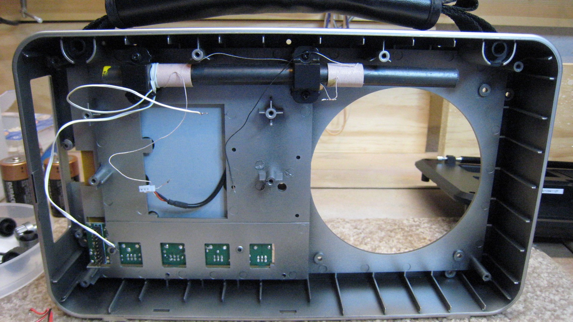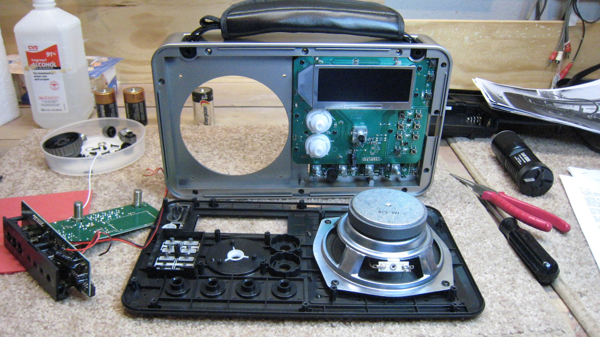 To disassemble the radio you will need a Phillips screwdriver and a soldering iron. The soldering iron is for 2 connections from the MW antenna to the external antenna input jack, two wires from the ferrite rod to the RF PCB, two wires to the battery compartment, and one for the rod antenna.