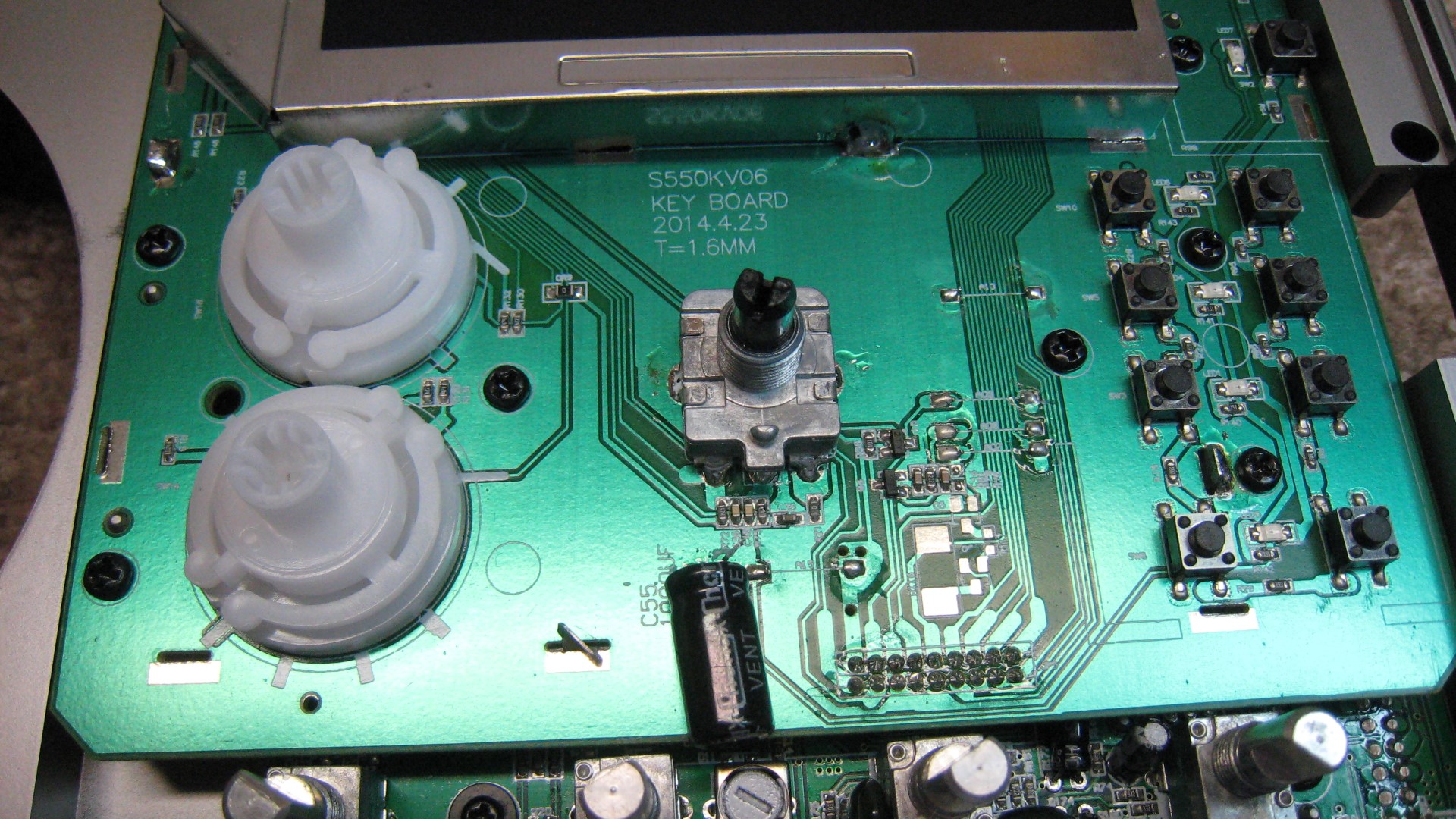 You have to then remove the RF board and the switch board as an assembly due to the socketed connectors holding them together. You do this by removing the 4 screws thru the RF board, then 3 smaller Phillips screws from the switch board. These are on the left side of the switch board, and connect it to the front panel. With these 7 screws out, pry out the bottom of the switch board from the connector, and then lift out the assembly. You can then separate the switch board from the RF board by prying them apart from the connector holding them together. You now have access to the DSP chip for which you must fabricate a shield with tabs to match the slots on the PCB.