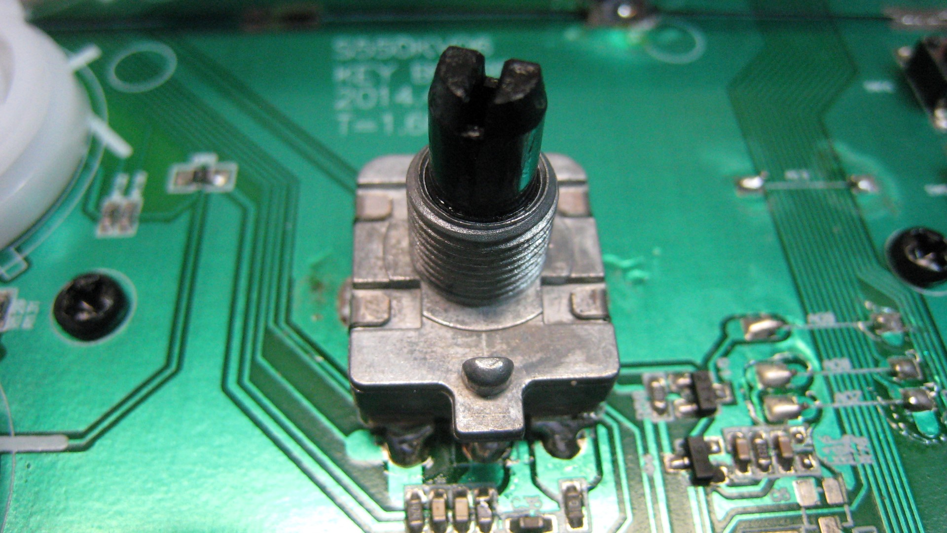 Once the front panel is off you will see the encoder. Gently pry the 4 tabs to the side just enough to remove the knob with the front part of the encoder assembly. Pull the plastic shaft out of the front piece and clean it carefully with Goo Gone or similar. Be sure not to damage the striped contact plate or the metal contacts beneath. I then cleaned it again with 91% Isopropyl alcohol and re-assembled, bending the 4 tabs back to lock the encoder together. It should now spin completely freely.