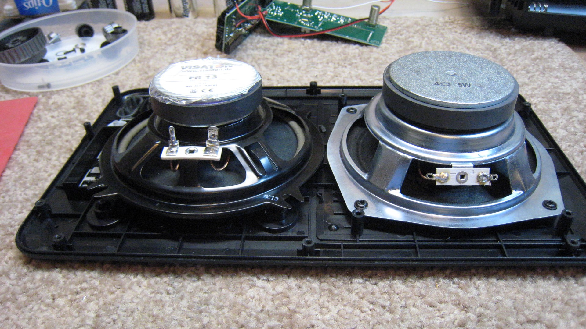 Better Speaker: It seemed that the Field is a bit lacking in the audio department…compared with similarly-sized radios its sound was a bit thin and lacking in bass or warmth. Substituting a better speaker yielded much better audio with a wider and more accurate frequency response. I don’t know how much this would cost Eton…certainly they could do it for less than what one must pay for an aftermarket speaker purchased at retail. The Visatron FR13 I used cost about $16. Its front is a bit thicker than the stock speaker but it fit into the radio just fine. I tightened the 4 mounting screws just until the metal mounting tabs of the speaker began to flex downwards a bit, then locked each of them with a drop of Loctite. Interestingly this replacement speaker looks less robust with a smaller magnet assembly than the original yet it produces a fuller sound without the midrange peak of the original. In the picture showing both speakers, the Visatron replacement is the black one on the left. The photo on the right shows it installed.