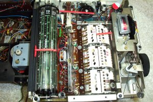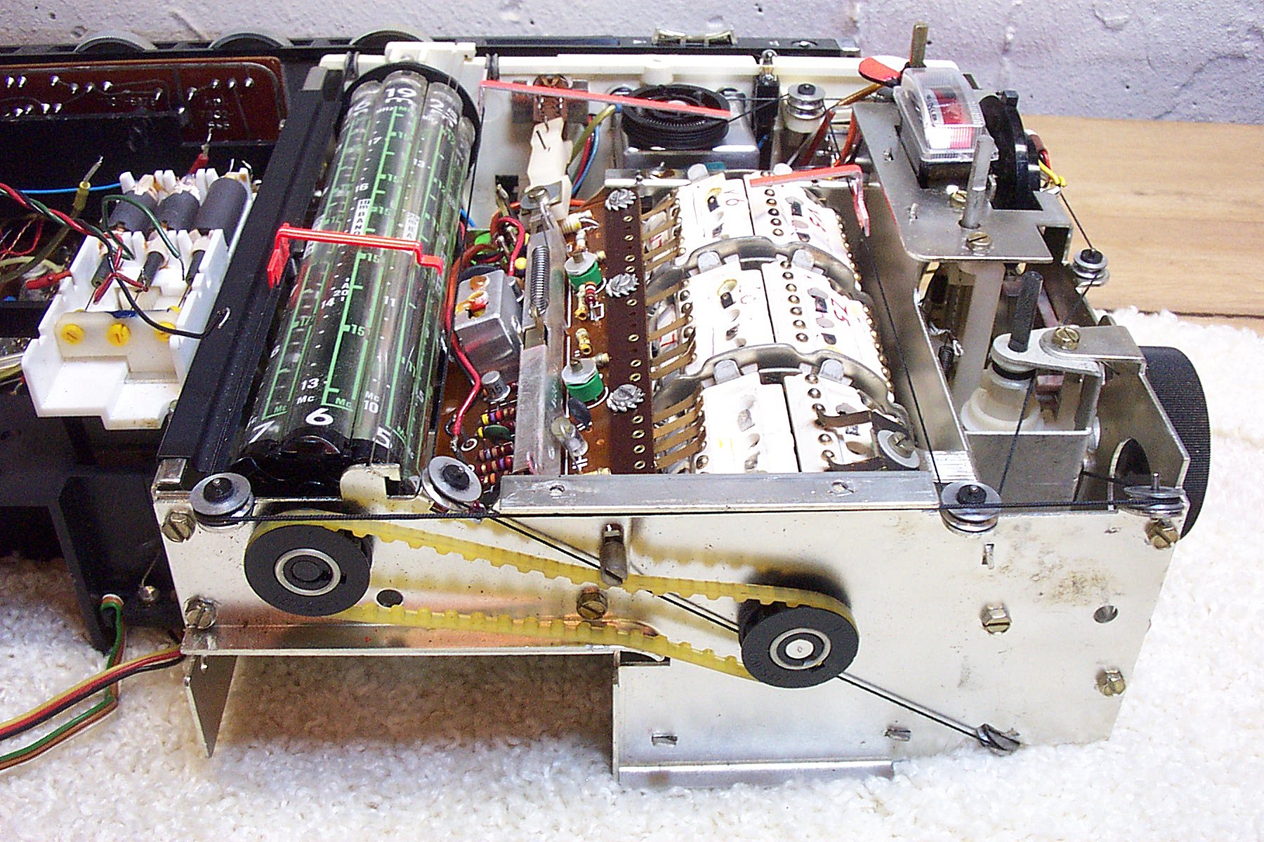 I was ready to learn…this European/Grundig designed radio was all new to me; nothing at all like any Sony or Zenith I ever saw. It is as different on the inside as it is on the outside. I found this monster PACKED with complex mechanical linkages, a toothed belt, three dial strings, that tuning clutch I described earlier and an amazing maze of switches and alignment points…clearly this was not like any radio I’ve looked inside before. My tubed and solid state Trans-Oceanics are almost simple by comparison. That’s both good and bad as you are about to see.