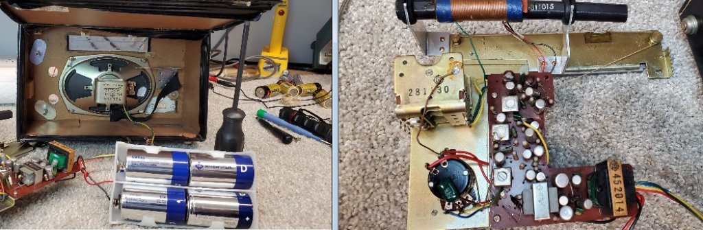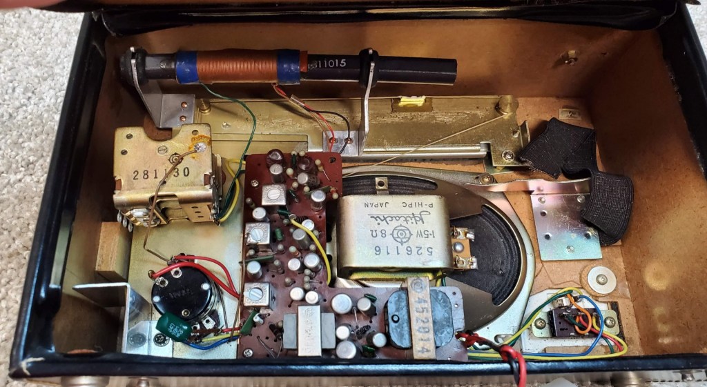 After getting further into the radio it seemed it may have previously been worked on and that means you don’t know what you might find. The service manual specifies AM coverage as 530 – 1605 KHz but mine measured 528 – 1685 and that discrepancy, in addition to ruining the dial calibration at the top of the band, is more than I would expect to see as a result of component drift over the years…it seems likely a previous owner may have attempted to increase coverage into the Expanded Band. The first thing I needed to do was to get the radio apart and it was a bit finicky in that regard. To explain, on some of the better radios (including the Zenith I will be comparing it with later) the entire chassis comes out in one piece making disassembly and re-assembly easy. The Hitachi requires either desoldering several connections or risking breaking the several wires connecting the battery box, battery saver switch, speaker and earphone jack with the circuit board. After getting the radio out of the cabinet I ended up lengthening those wires so I didn’t have to desolder them again…even the battery box wires were so short they had to be strained just to change the batteries…now there is enough slack to make this less cumbersome.