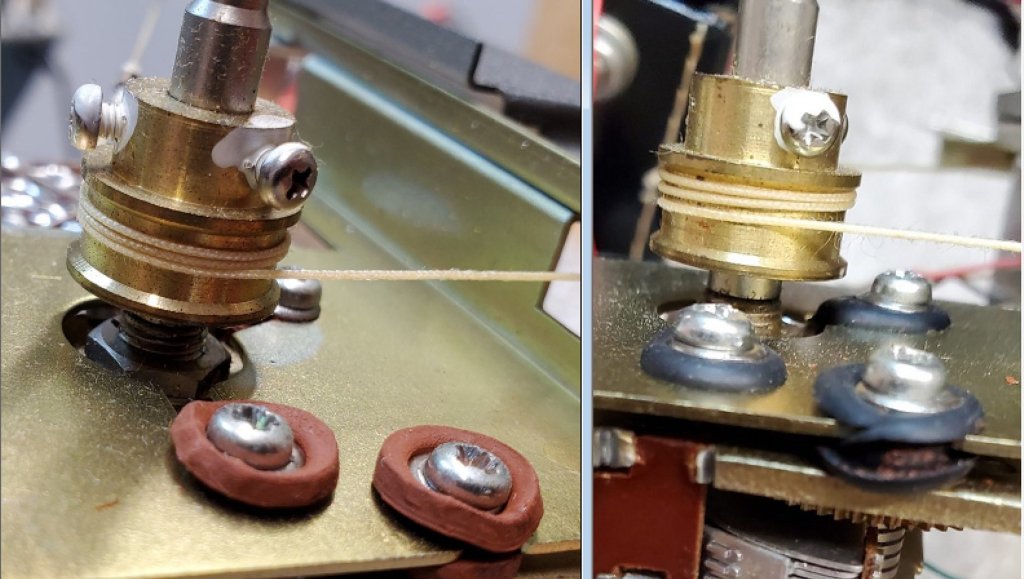 I discovered that the loose washer stuck behind the dial glass was half of a deteriorated rubber grommet. Three of these are used to mount the tuning gang while insulating it electrically from the chassis. Two were crumbling and the third had broken away completely so the tuning gang was dangling loosely…amazingly the radio still seemed to tune pretty normally. I found some rubber grommets and although the ones I got are a bit larger than the originals I was able to squeeze them into position so the tuning gang was now properly mounted and insulated. (Some radios do not insulate the tuning gang this way and I’m not sure what the purpose is…the radio seemed to work either way. I suspect it may affect some stray capacitances near the tuning condenser).