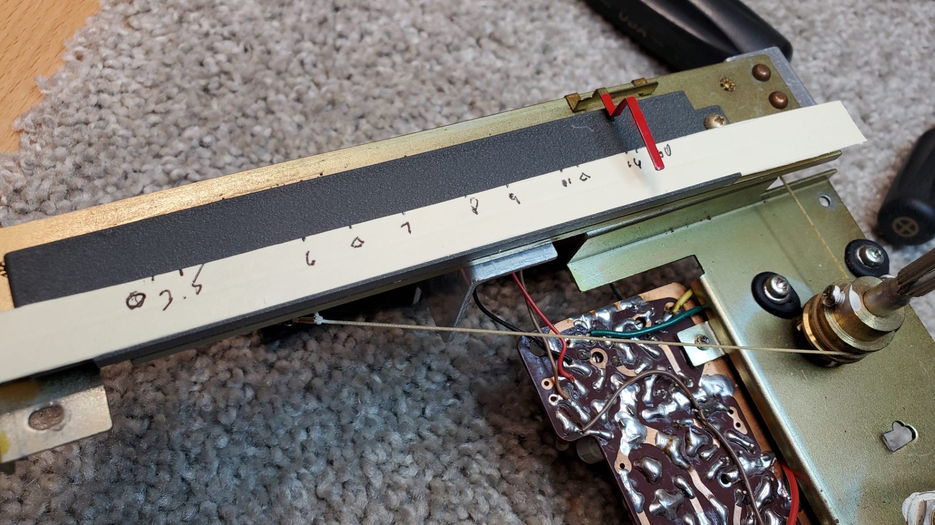 The IF’s were all spot on which was reassuring but the RF adjustments were somewhat off. I had mentioned that as received the AM band topped out at 1685 KHz which was clearly incorrect and the dial calibration was off over the top third of the band as a result. SAMS specifies 1605 KHz as the top end which is lower than the usual 1610-1620 KHz we usually see, and I ended up getting the best overall results using 1620 as the top limit…setting it up this way the dial calibration was virtually perfect across the whole band. Also, since the dial scale is not present with the radio disassembled, I made up a template to be sure dial tracking was good during alignment…a trick I have used with many radios. After alignment reception was reassuringly strong and clean.