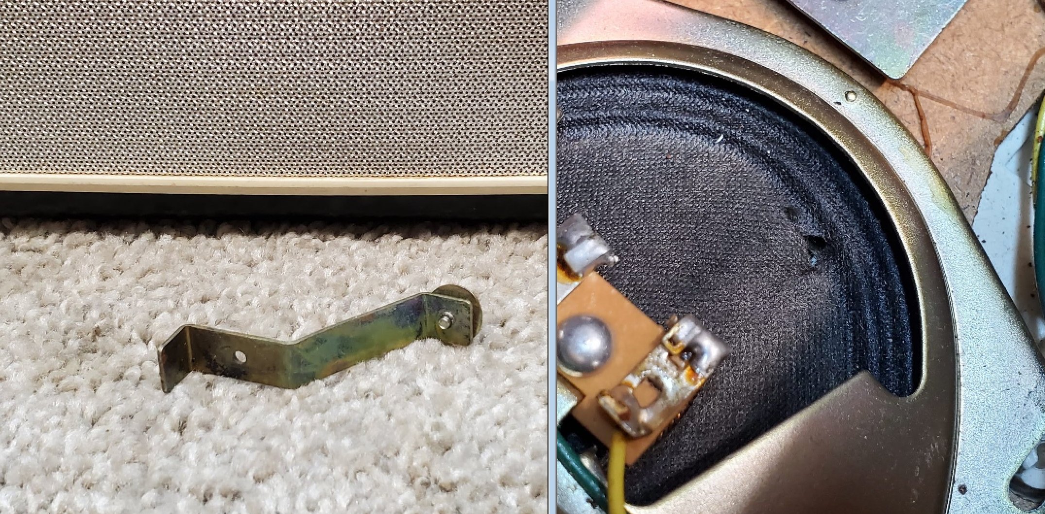 Above: Loose Bracket Found Inside Radio & Damaged Speaker Cone
