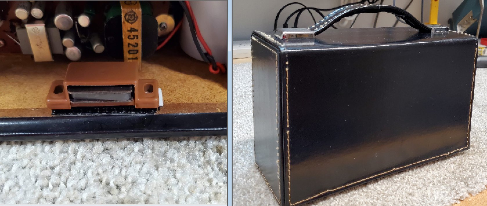 Checking It Out: The seller had accurately described one issue with this sample…the leather snaps which hold the back closed were broken off…I eventually used a magnetic latch to keep it closed. I also found a metal piece loose inside which turned out to be a PCB support bracket that had broken loose in shipping…both of its screws were present but its mounting stud which is one of the speaker mounting studs was broken. Luckily the radio can be used just fine without it but when all repairs were done, I glued that broken stud back in place as much for appearance as anything. I also noted some sort of washer stuck behind the dial glass and was curious to see where that came from.
