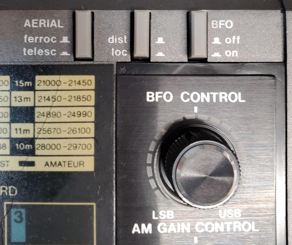 The Aerial button lets you select between the internal ferrite rod or the whip or external antennas on AM/LW. Although not generally useful in the typical home, if you are in a very low noise location such as outdoors away from noise sources, the whip greatly increases sensitivity and reduces the noise floor. Indoors it has just the opposite effect. This is one of the relatively rare features of the D 2935. Interestingly, The DX/Local switch does not operate on AM/LW when using the ferrite rod…it does work when you select the Whip/External antenna. There is also a Variable Gain knob but it only works in SSB mode…another oddity.