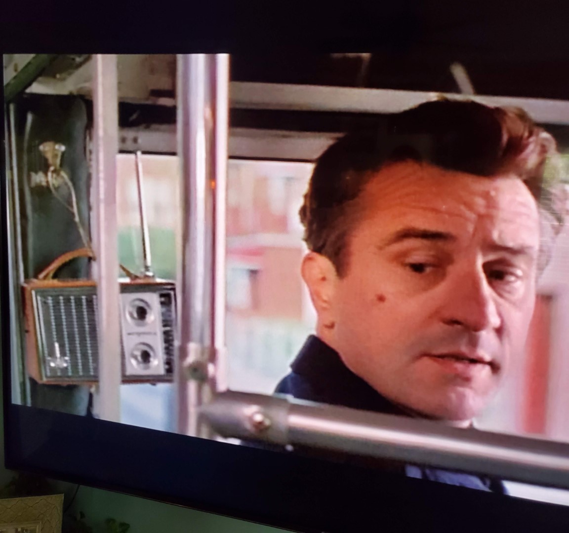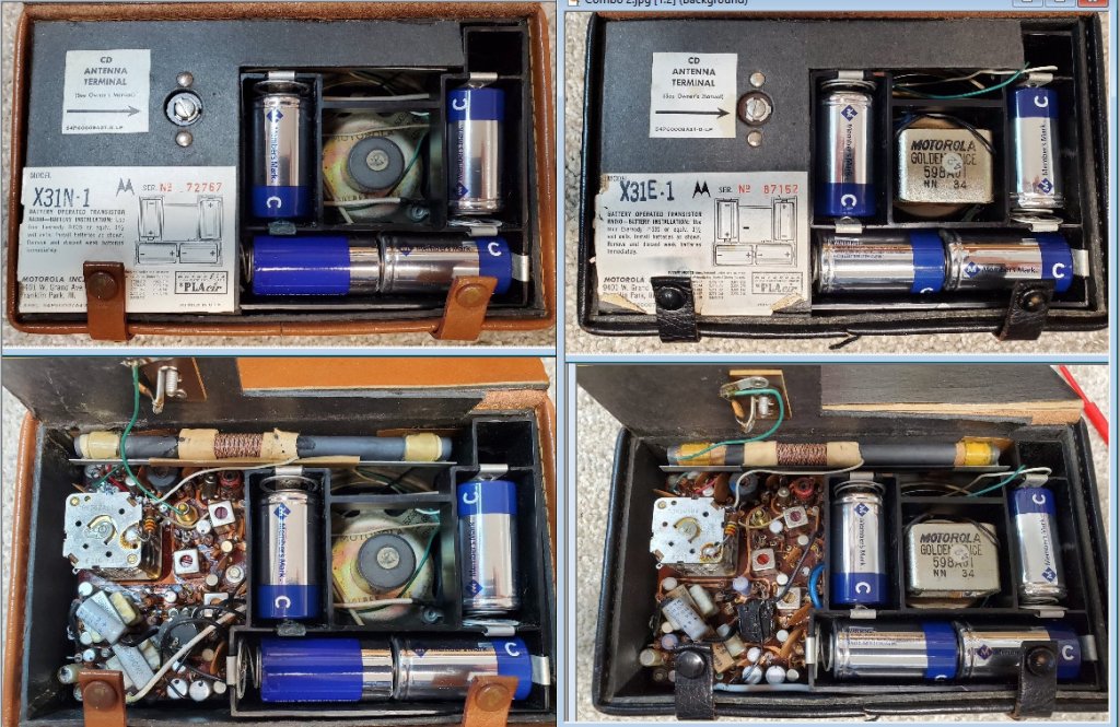 This is an 8-transistor design featuring a tuned RF stage, three gang air variable tuning condenser and a decent-sized 5 1/4” ferrite rod antenna for potentially excellent performance. There is a 3” speaker labelled Motorola Golden Voice although the two radios I have contain different versions of the speaker. The only controls are On/Off/Volume and Tuning knobs and a novel Battery Life switch which I will describe later. Power is supplied by 4 C cells and there is a mono earphone jack. One thing I’ve mentioned before…batteries must have increased in size since the 60’s…my typical alkaline cells were an extremely tight fit, requiring lots of effort to install and remove. I really like the unique leather cover which can snap on the front for protection during transit or placed on the back for convenient storage…pretty cool. I found an old ad which revealed this was the top of the line of 3 similar models and retailed for $49.95 although at least one price I found indicated it may have sometimes sold for as low as $35 or so. I also remembered that it was featured prominently in the Robert De Niro movie “A Bronx Tale”. (Humorously, the producers added a whip antenna for effect…this was also done with the now well-known Packard Bell 8RT2 “Gilligan’s Island Radio”. Artistic license I suppose but I wouldn’t be a radio nerd if I didn’t point it out).