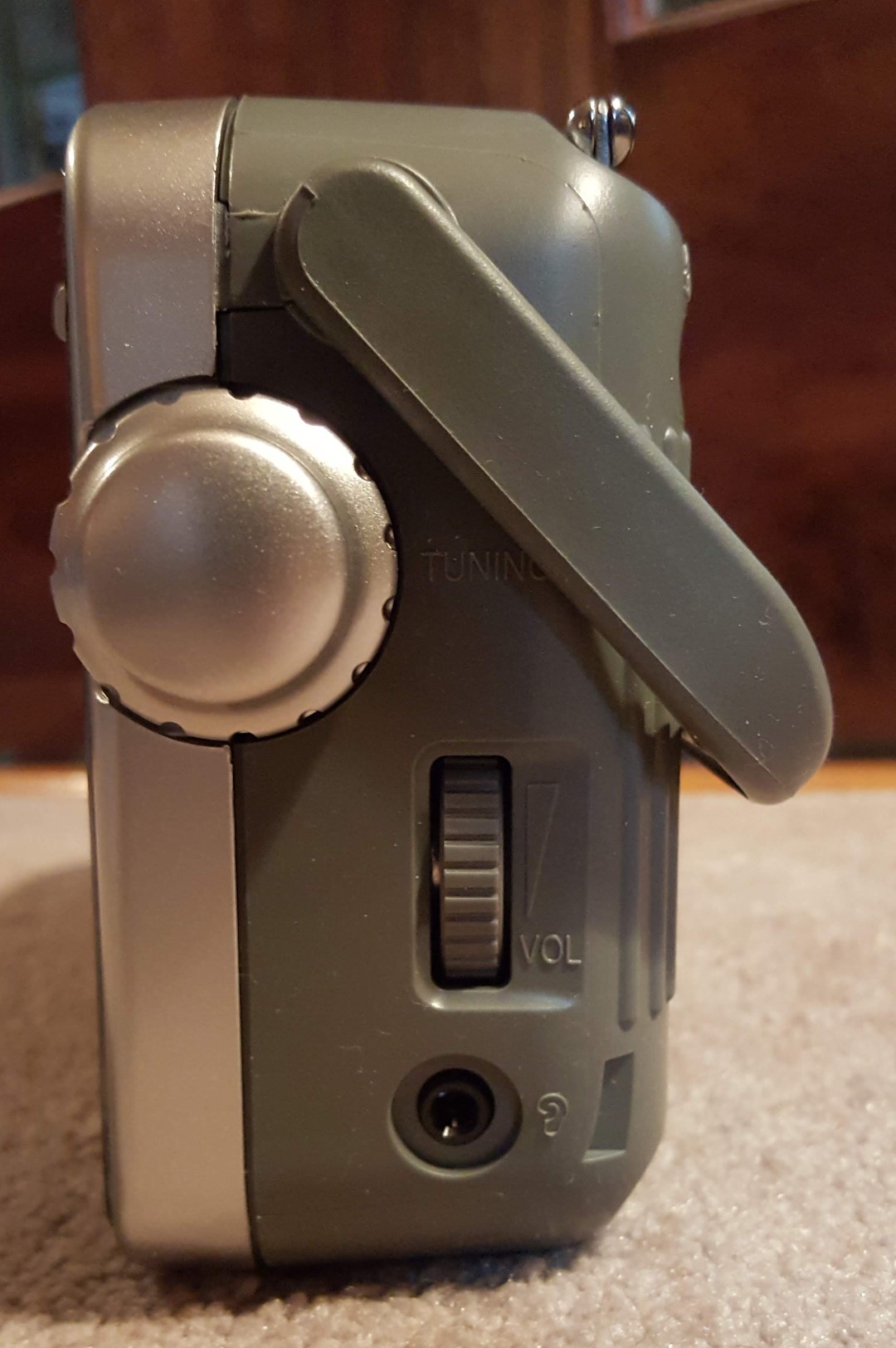 Controls are basic – an On/Off AM/FM Selector slider, a rotary tuning knob, thumbwheel volume control and a Tune LED. It is a cute little radio with a convenient folding carry handle which also acts as a support to rest the radio at an angle if so desired.