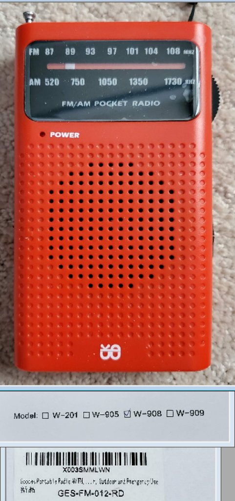 This one’s box had two model designations as you can see, labeled both as the GES-FM-012-RD and also as the W-908. This radio was discontinued before I published this article but is still available as the Goodes in Black or Silver with no model name given at Amazon. This sample had low volume on AM which may be a sample defect, although it has exceptionally good reception and sound on FM, on a par with the Sangean SR-35. Has a Power LED…larger than most in this group.