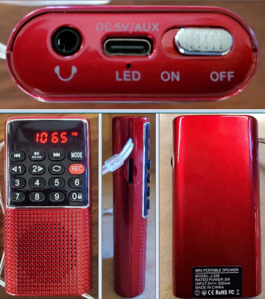 A reader named Chris Morris suggested I look at the tiny J-328. It is not a new model but it has received a few updates since it was first introduced several years ago. It is currently selling on Amazon for $16.99 and measures only 3.7″ x 1.9” x .75” and weighs a mere 2.54 oz. It is small enough to slip into a shirt pocket, yet it offers FM with Auto Search and Store (70 – 108 MHz), SD/Tiff card record and play (MP3 format only), USB charging with a 500 mAh battery, 3.5mm/1/8” Headpnone jack, Aux input, Lock mode, Lanyard FM antenna (see text) and a great sounding speaker.