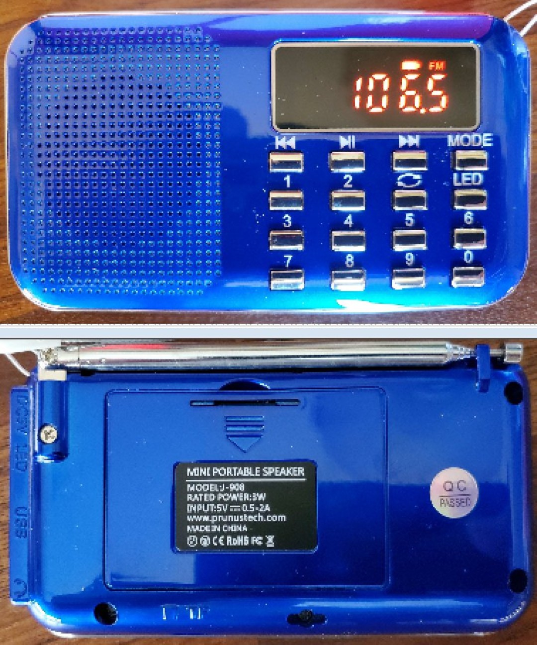 Final Thoughts: Comparing the two models it is hard to fault them given their tiny size and low prices. The J-328 has slightly fuller speaker sound and the ability to record on an SD/Tiff card while the J-909 plays only. The J-909 has a user replaceable battery and a flashlight in addition to AM. If you want a tiny radio with SD card Record/Play capability and true shirt pocket size the J-328 warrants your consideration. Or the J-909 might work for you want AM and can forgo SD record capability.