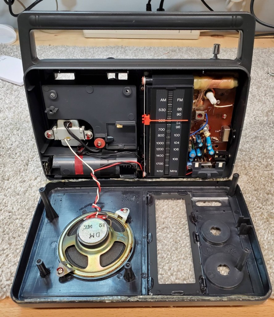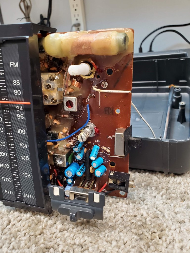 Initial Observations & Disassembly: The radio arrived and looked pretty good…it just needed some light cosmetic cleaning. But I noticed some wetness in the battery compartment from a recent battery leak, the volume control was staticky and the tuning seemed to slip towards the high end of the band. Clearly this would give me reason enough to open it up and look inside to see how it was made.