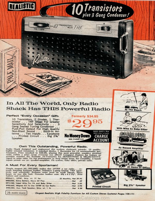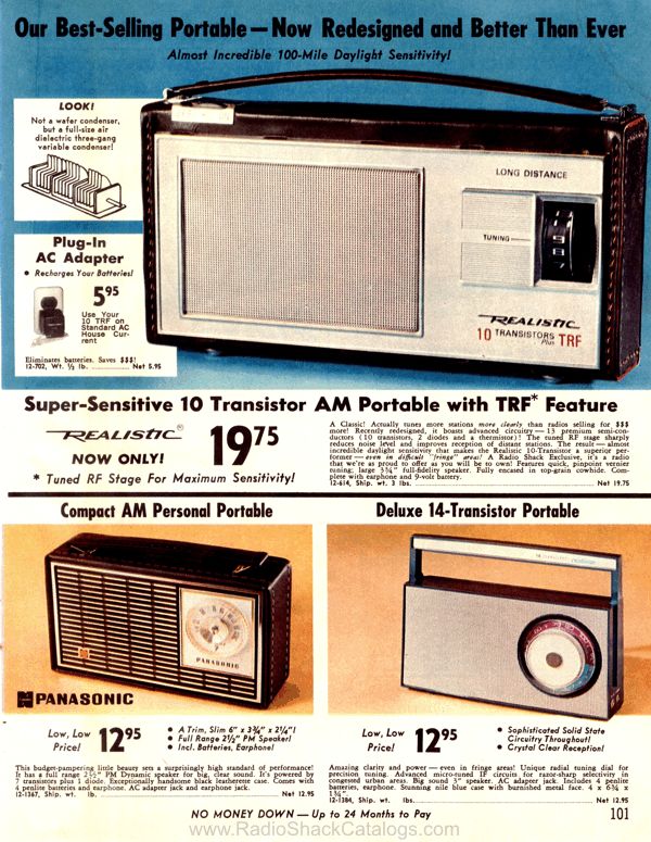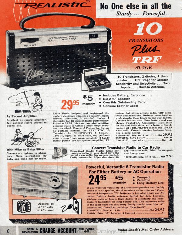 But there are exceptions to every rule. Back in the day I bought and returned two of the 1965/1966 Realistic TRF radios because they were inferior to several other 6 transistor radios (with no tuned RF stages) I compared them with. Evidently that RF stage didn’t guarantee that it was a properly designed radio overall or that other circuits in the radio didn’t ruin its performance. Maybe this shouldn’t have surprised me when a Zenith Royal 500H retailed for $59.95 while the 1965 Realistic TRF cost only $19.95. Luckily the model was vastly improved by 1968 (and still was only $27.95) with a model finally worthy of the name and that radio was produced essentially unchanged through 1972. By the way you can see all of the vintage Radio Shack catalogs at this website…it is phenomenal!