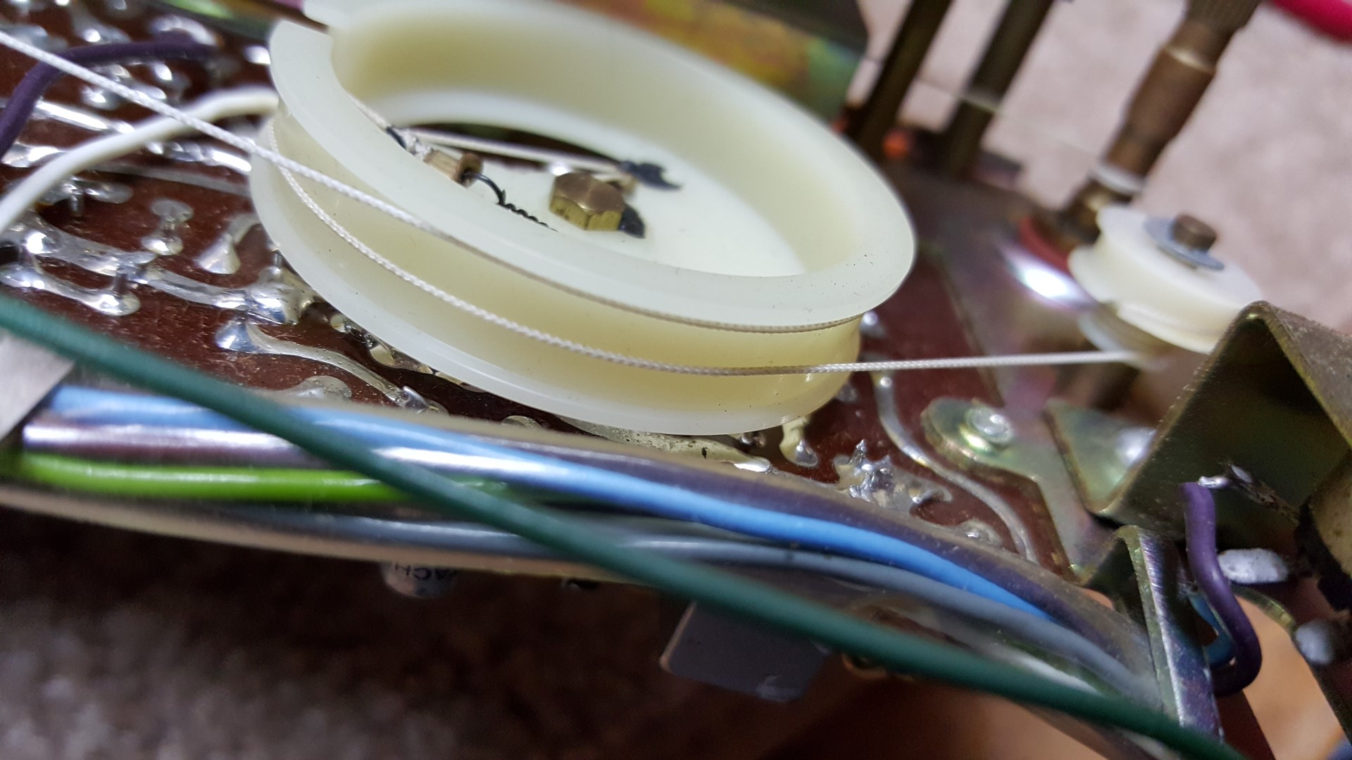 I eventually came into possession of two of these radios – one which I recapped and the other which was already done for me. I had one of those gotcha moments as I was installing the last cap in the first set as my soldering iron touched the dial string which instantly sprang apart…not a good feeling. The dial string on these is not only no longer being made (and unusually thin compared with the dial cord I had on hand) but it utilizes a unique two-step pulley design which made figuring out how to install it trickier that it would otherwise have been for what looked like a very simple dial cord arrangement.