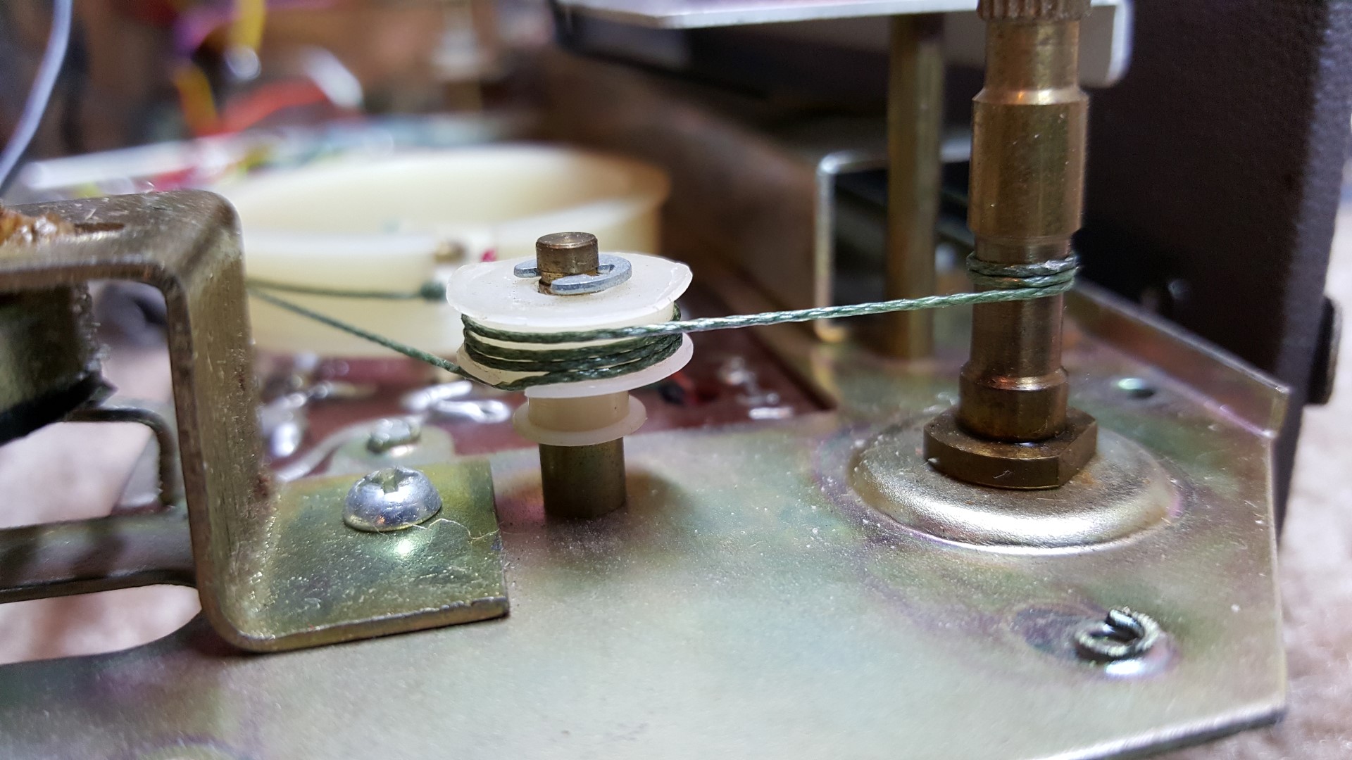 To explain, the two-step pulleys are a clever way to allow the dial pointer to move a large distance across a long dial scale while using a small pulley on the tuning condenser and a single dial cord rather than two in a gear-reduction design. That single dial cord actually moves at two different rates of speed between the different size pulley steps. While this design is clever indeed, it makes it mandatory that any replacement dial cord be no thicker than the original because the pulleys won’t accommodate it.