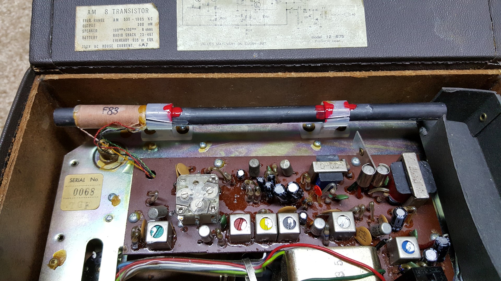 Performance: Although I had previously found the earlier models to be disappointing I was ready to be bowled over by this radio even before I received it. I tend to love old analog AM portables with huge analog dials and this radio really fits that bill. After these radios were recapped and aligned I was able to test them with the stock 6 ferrite rod antenna and again after replacing them with 8” ferrite rods. I found the performance to be good but not stellar. In the AM Mega Shootout listing the 12-675 rates as *** with it stock ferrite rod and **** with the 8” rod. This does indicate very good performance but not in the category of the ***** star radios. I also have to say that the sound is not of the highest caliber either. The stock speaker is distinctly midrange heavy and not very detailed or clean sounding…kind of mushy. I must say I don’t get much enjoyment listening to this radio. Is it possible other samples of this radio perform better? I suppose so. But the two I have are so identical it’s easy to assume they are typical and any hotter units are the exception, but until/unless I ever see a better sample for both RF performance and sound quality (at which time I would update this article) I rate the 12-675 at *** with it stock antenna and **** with a transplanted 8’ rod. And if anyone has a unit they think is better than this and would care to loan it to me for comparison I would certainly welcome that opportunity.