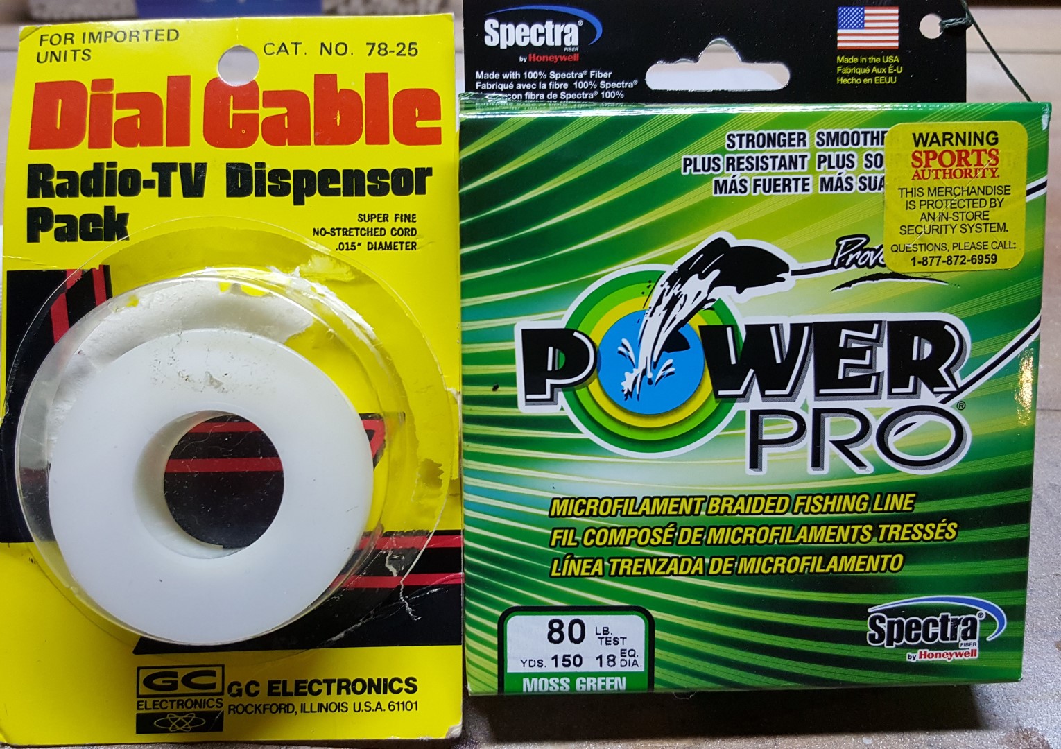A friend eventually supplied me with some of the correct dial cord but not until after I had tried 4 kinds of fishing line and found one that actually worked perfectly…it is pictured here. It is actually a hair larger than the original string as you can see by comparing their diameters so if you can find a slightly smaller size it will match the original more closely, but this string worked perfectly for me…see picture.