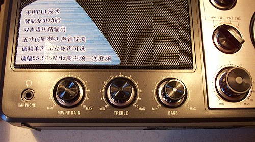 Controls: The roomy front panel contains the large Tuning knob, to its left are the mode and band selector knobs with the Volume Control at the bottom. The smaller knobs at the lower left are RF Gain, Treble and Bass, and a 1/8″ Stereo mini jack for headphones is at the far lower left.
