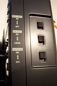 The left side contains RCA Stereo Line Out jacks, Battery Size Selector, DC and AC Power in jacks. The right side contains switches for Button lights, DX/Local and Internal/External Antennas. The Button Lights switch allows the push-buttons to also illuminate when the dial light is on, evidently a power saving feature.