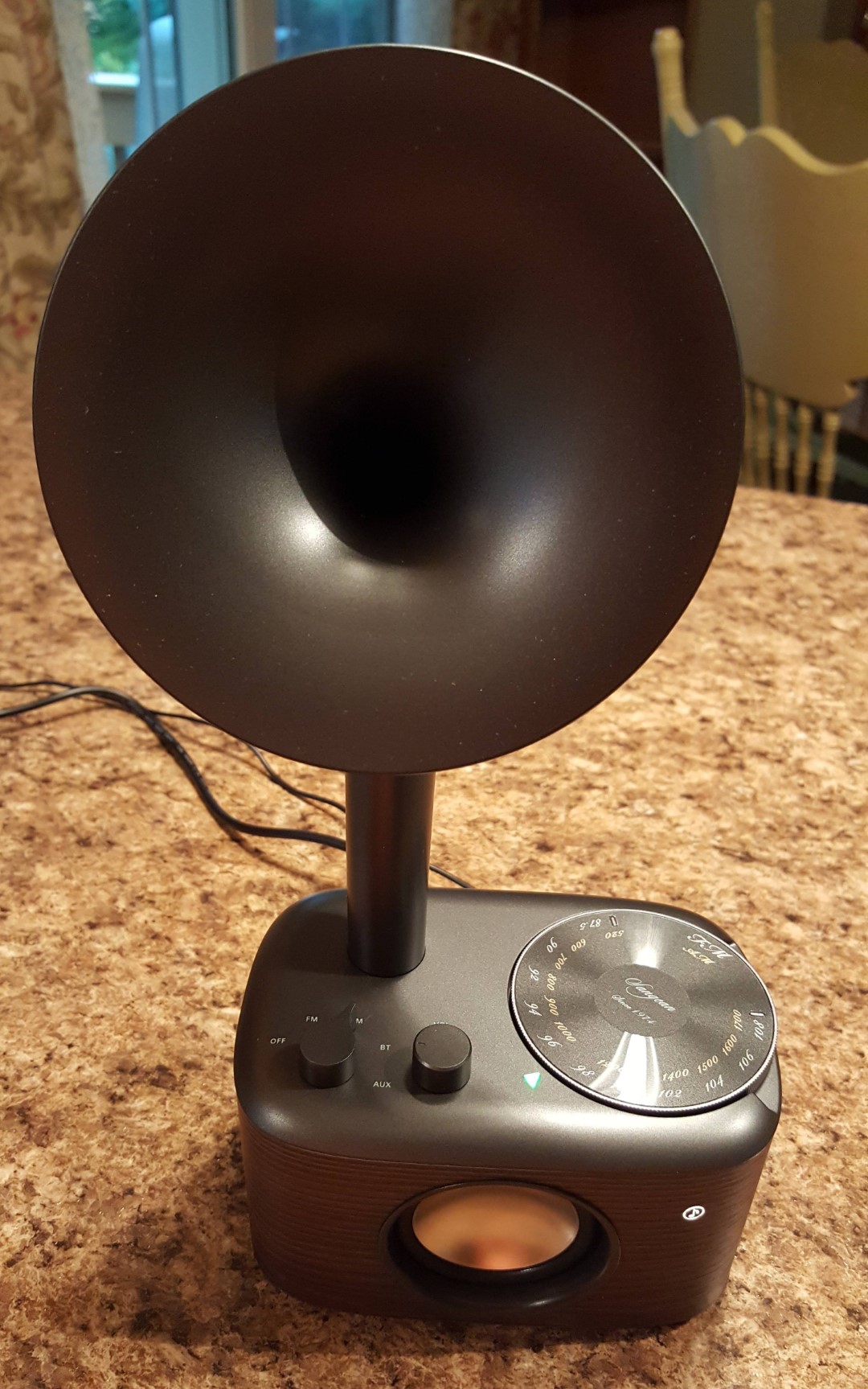 I must admit that I didn’t know quite what to make of the CP-100 when I first saw it on Sangean’s website. The design resembles the horn speakers of vintage acoustic wind-up 78 record players and I had to have the radio in my hands before I understood what it is. In brief, the horn is an elegant design for an acoustic port to augment the bass response of the front-firing speaker. Usually such ports are on the back of a radio or hidden from view elsewhere – Sangean has many radios that use such hidden ports and they are very effective. According to Sangean’s website the CP-100 employs an “Acoustically Tuned Cabinet with Front Speaker and Bass Reflex Design for Richer Smoother Bass Response” and their design seems to be very effective. In this case, Sangean decided to use the port to create a retro look that harks back to the days of fully acoustic (non-electric), wind-up Victrolas, and I must say the CP-100 will elicit comments from your friends who see it. Leave it playing in plain view when friends visit and see what happens!