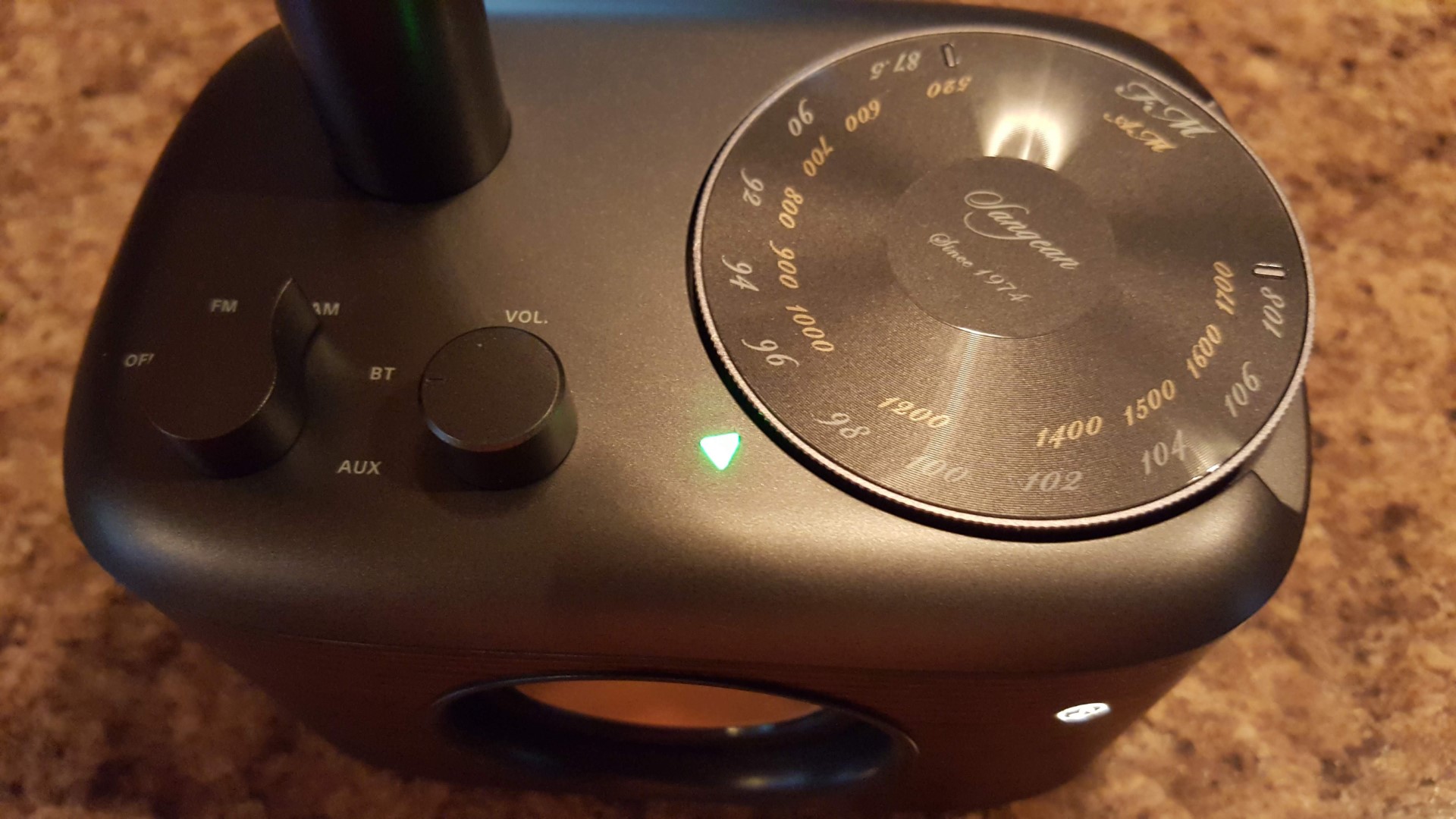 Looks aside, the CP-100 is a straight-forward design. It consists of an AM/FM tuner, and in addition to Bluetooth capability it also features an Aux in jack to plug in external audio sources. Unlike the Sangean WR-7 (which is a favorite of mine) it is AC operated via an external wall-wart power supply and has no internal battery but it adds AM which the WR-7 lacks. There is a LED Tuning indicator – Sangean’s website says this is also a Charging LED but it is not as there is no internal battery.