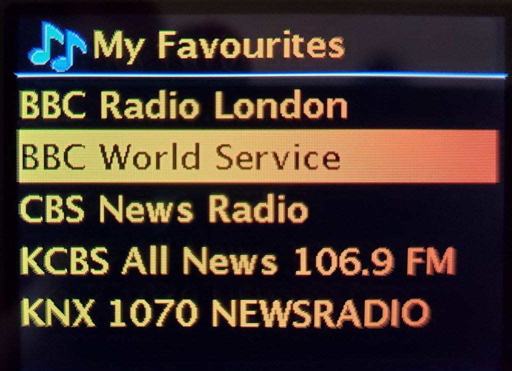 First Impressions: As I mentioned above, basic setup and connection to my home WiFi router was straight forward. Using the Tuning Knob to scroll characters and pressing it in to select them I was connected and looking for internet stations within minutes. The WFR-28 is sold in two versions, with the addition of DAB- Digital Audio Broadcasting in the European version. But even though my US version lacks DAB (which does not exist here in the US) the radio’s menus are UK-oriented, with Favourites instead of Favorites, Equaliser rather than Equalizer. Not a complaint…just an interesting observation.