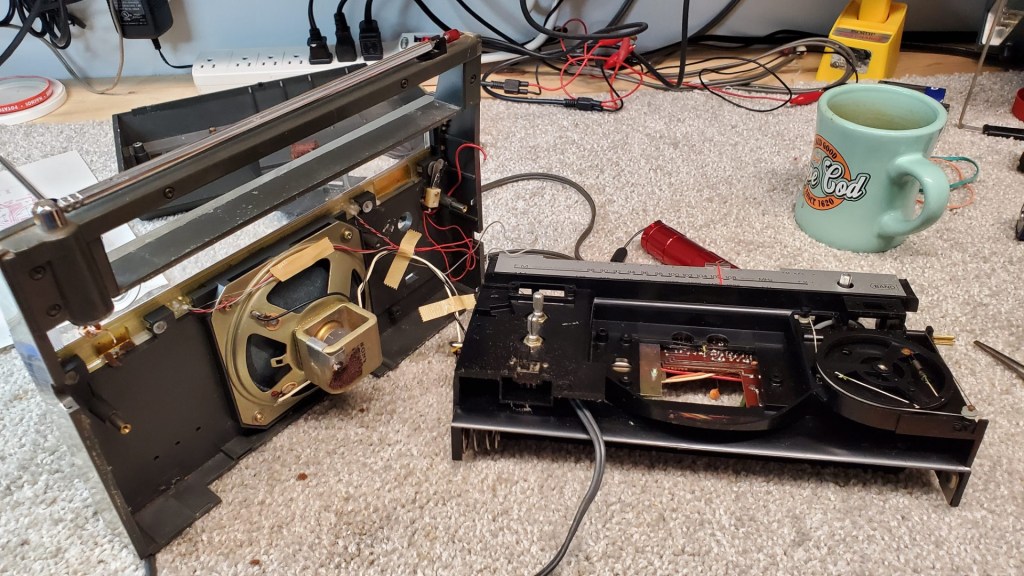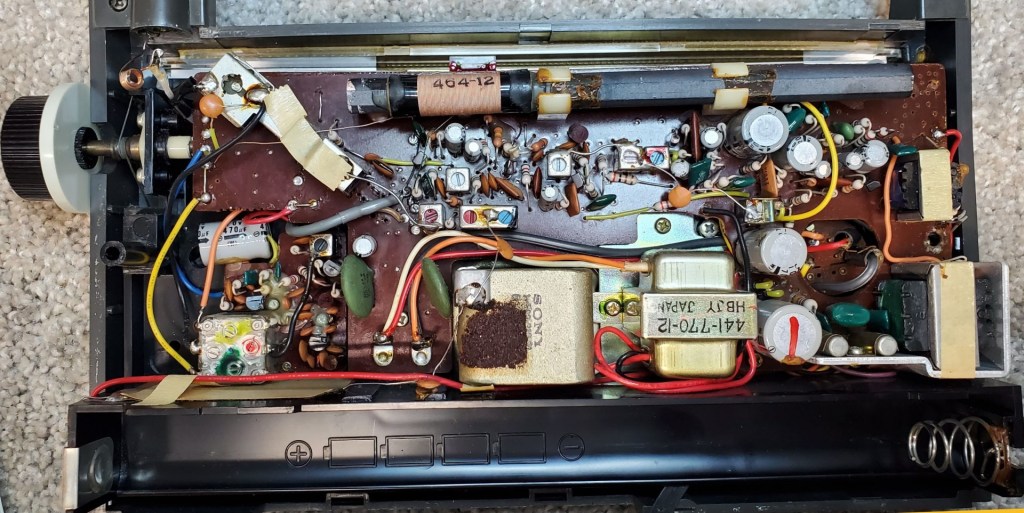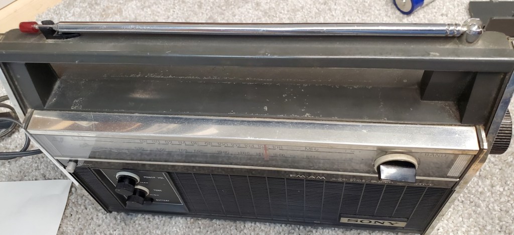 As I often try to do I found a cosmetically challenged (read: inexpensive) unit on eBay. Luckily it arrived with no operational defects but the dial pointer had somehow broken (perhaps in shipping…I’ll give the seller the benefit of the doubt), and although tedious I managed to get it glued back together. The AM/FM band switch was very erratic but a few shots of De-Ox-It restored normal operation there. The biggest challenge was cleaning its filthy exterior along with lots of crumbling foam inside and although it is still not pristine it looks good enough that I can enjoy handling and using it and it displays nicely. Cleaning a dirty old radio can be very rewarding.