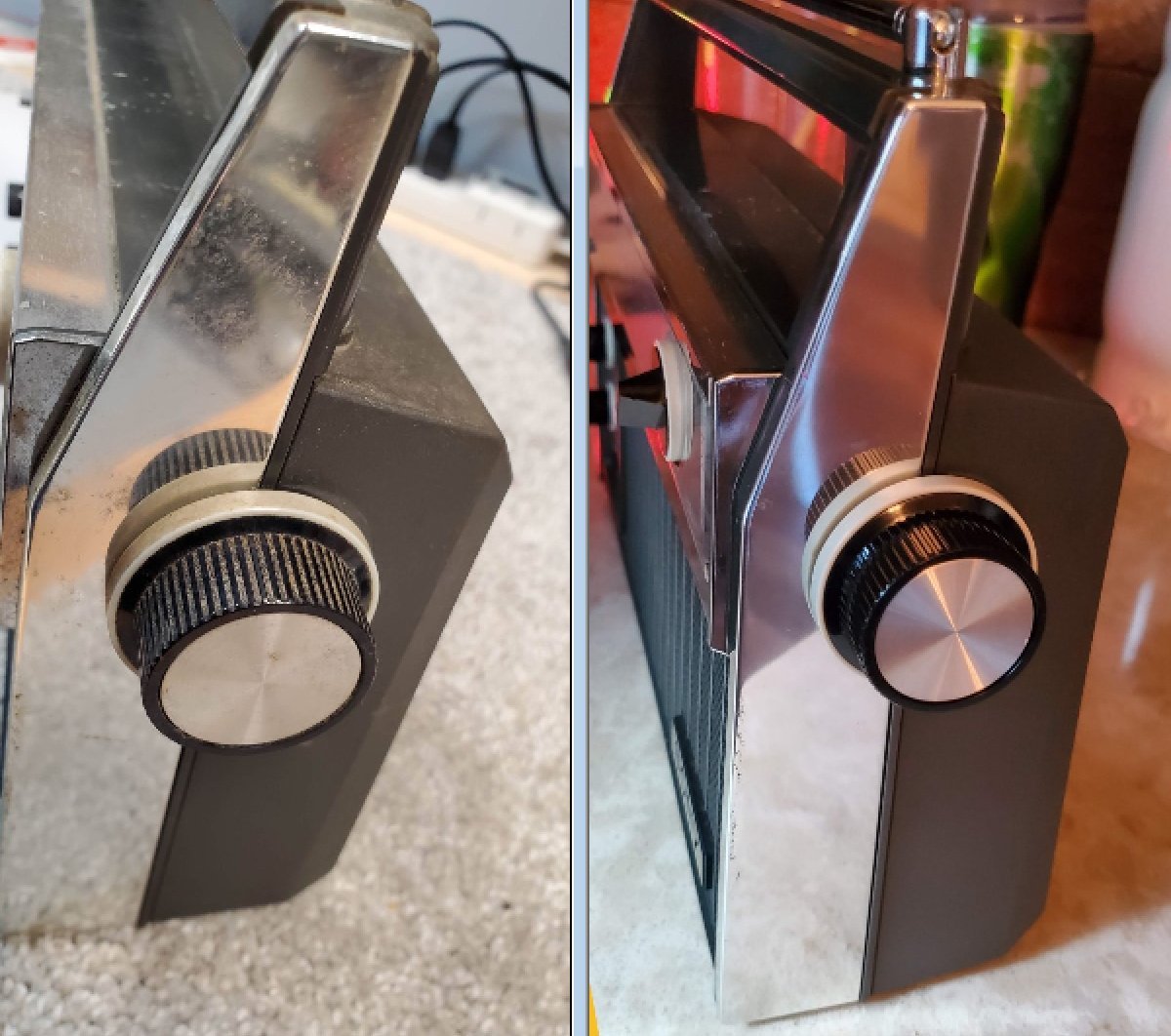 As I often try to do I found a cosmetically challenged (read: inexpensive) unit on eBay. Luckily it arrived with no operational defects but the dial pointer had somehow broken (perhaps in shipping…I’ll give the seller the benefit of the doubt), and although tedious I managed to get it glued back together. The AM/FM band switch was very erratic but a few shots of De-Ox-It restored normal operation there. The biggest challenge was cleaning its filthy exterior along with lots of crumbling foam inside and although it is still not pristine it looks good enough that I can enjoy handling and using it and it displays nicely. Cleaning a dirty old radio can be very rewarding.