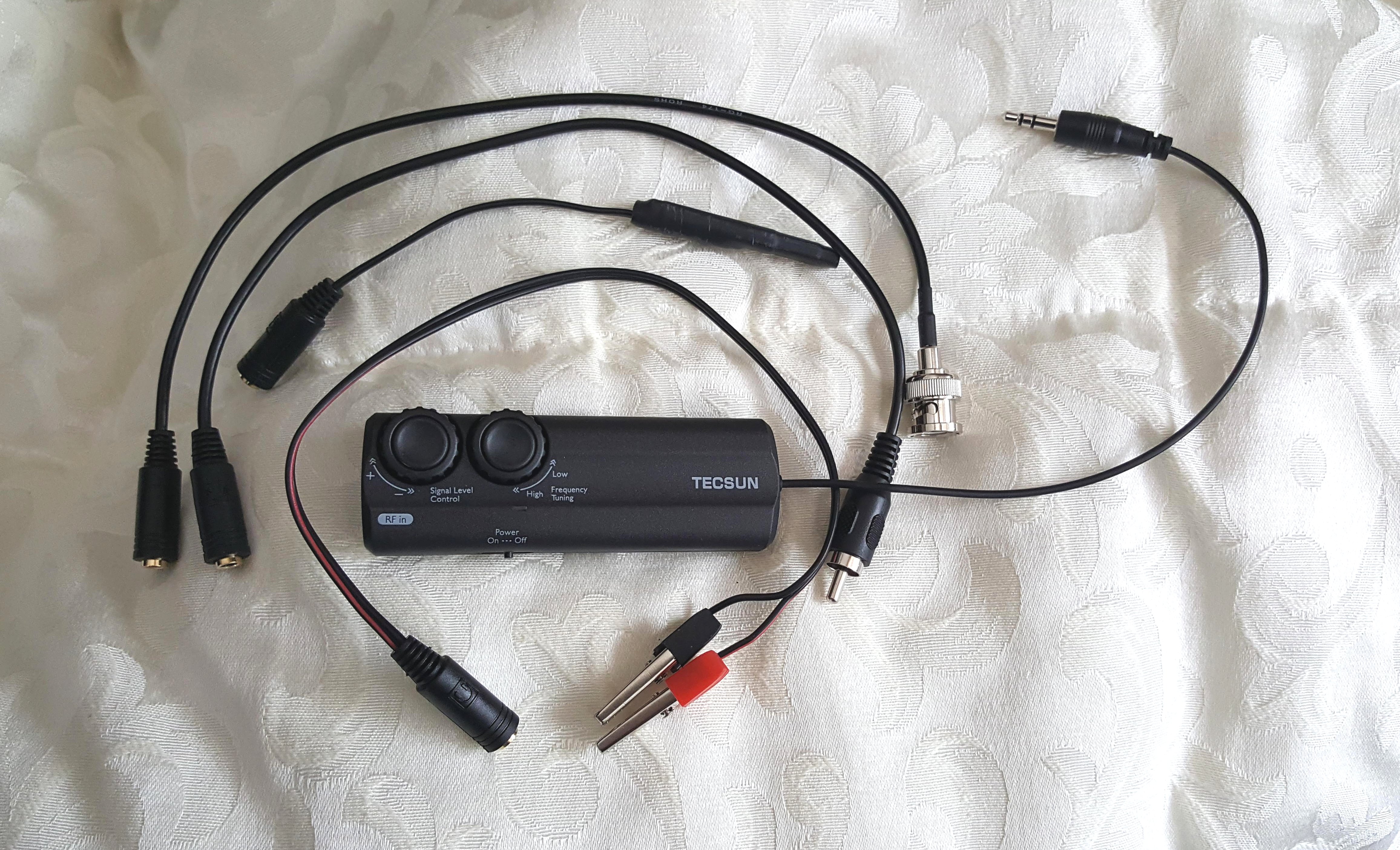 One improvement here is the unusually wide range of connection possibilities the AN-48x offers. It is supplied with output adapters for 1/8” mini-plug, BNC, RCA, clip leads and of course, a ferrite sender to radiate AM/LW signals directly into most radios. They also include the same style ” Base Station” introduced with the Aadwards which is a cleverly designed plastic stand which holds the ferrite sender against the back of small to medium-sized radios while holding the radio at a convenient angle. It would be nice if this stand actually snapped together…as it is, the two pieces merely rest on one another so it will come apart when you lift it up unless you grab both pieces together. A small nit to pick I suppose because it is a cool accessory.