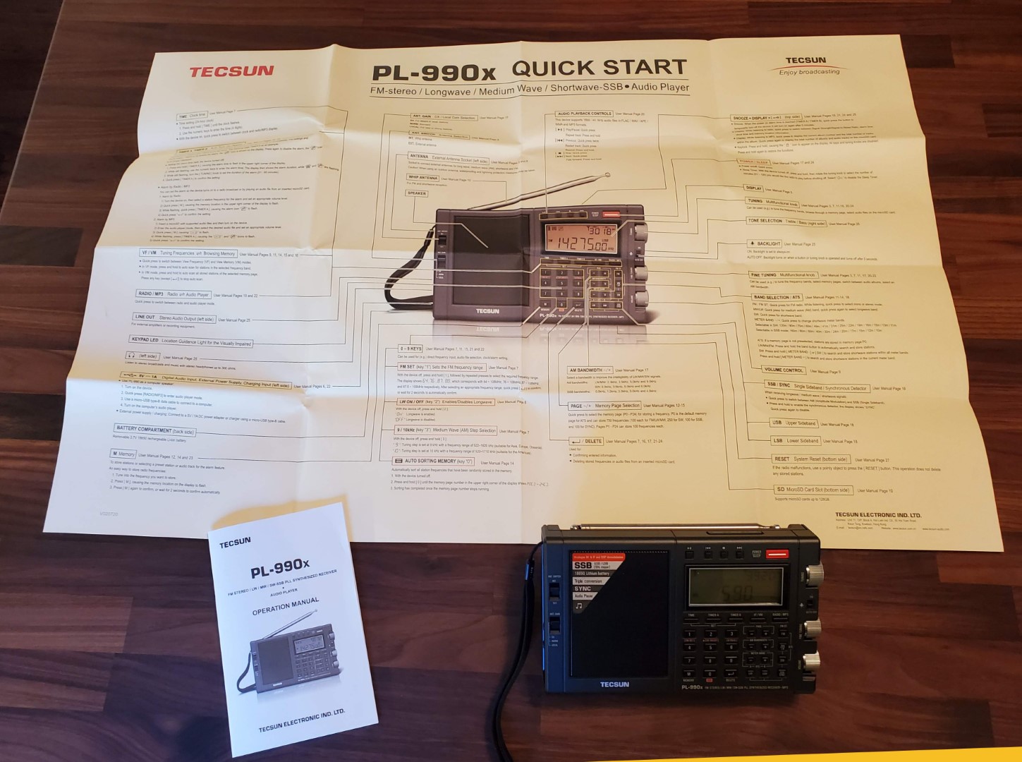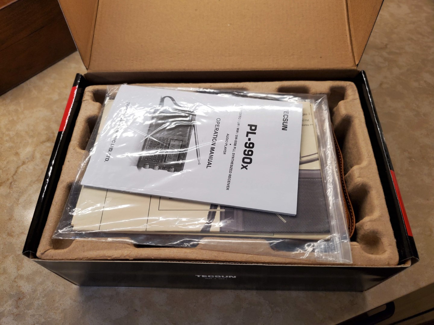 Tecsun has also upgraded their standard accessory package for the PL-990 by offering their nicer carry case, a windup reel antenna to replace the plain wire provided in the past, some upgraded earbuds, a spare battery and that very nice, large foldout one-sheet.