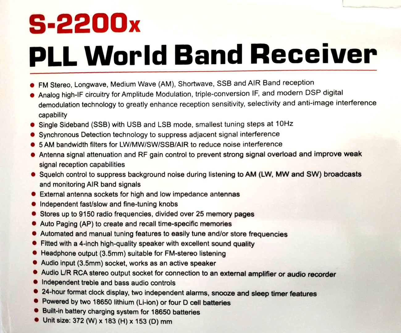 Anna at anon-co.com graciously sent me a review sample and advised that the new S-2200 is an entirely new radio inside the original cabinet. Although Tecsun hasn’t specified which DSP chip the radio uses the new radio uses a similar topology to that of Tecsun’s H-501 with Triple Conversion including an analog PLL front end followed by the DSP chip. It is now selling at anon-co.com for $372.