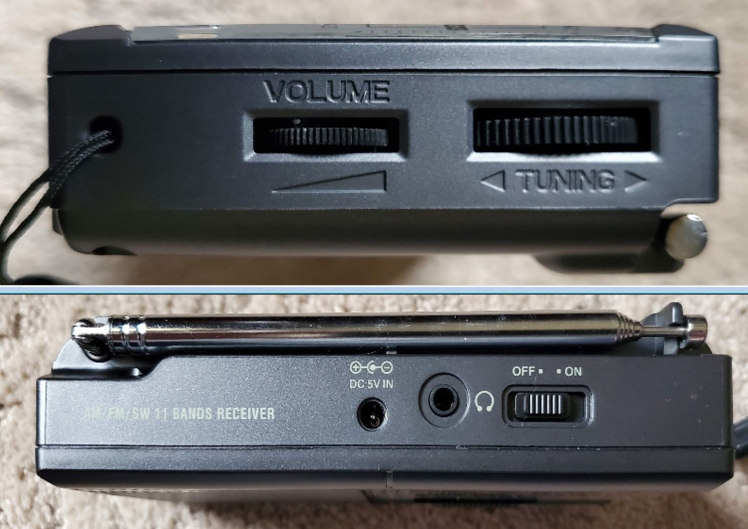 Controls: On/Off switch, Volume & Tuning thumbwheels, Band Selector switch