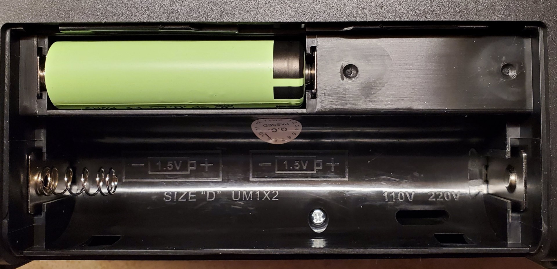 *Warning! The rechargeable 18650 Li-ion cell is connected in parallel to the D cell contacts (!!!) so NEVER USE THE USB CHARGING CABLE WHEN STANDARD D CELLS ARE IN THE RADIO! A leakage or fire danger will result. If using the 18650 battery remove the D cells. If using D cells remove the 18650 battery and DO NOT PLUG IN A USB CHARGER.