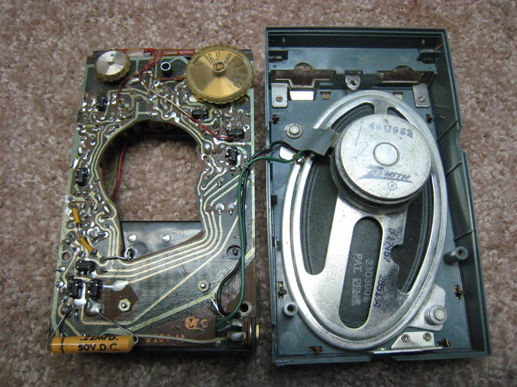*Most early Zenith sets had socketed transistors, clearly with the thought that they would need to be replaced occasionally, as in tube sets. While some early transistors did suffer a higher defect rate than later ones, transistors turned out to be very stable and reliable. We have since learned that transistors are usually longer-lived than the electrolytic capacitors which often require replacement in vintage electronics.