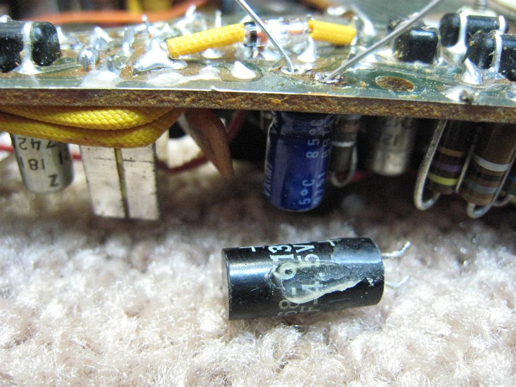 By far the most troublesome components in these old radios is deteriorated electrolytic capacitors. These radios generally have 4 of them and you can expect to find many bad ones, although I have found several H sets that were fine as is. Symptoms of bad caps usually mimic weak batteries; thin, distorted audio and greatly reduced sensitivity. If you are routinely restoring old electronics I strongly recommend the purchase of an ESR meter such as the EDS 88A (http://www.eds-inc.com/cap.html)…it lets you check electrolytic caps in circuit and will save lots of time. Without such a meter you will simply have to replace caps until the radio (hopefully) springs back to life. If you are only working on one or a few radios I would just replace all the electrolytics in them…they generally cost about .20 apiece from the electronic on-line retailers…perhaps $2 apiece if you can still find them at Radio Shack. The audio coupling cap in series with the wiper of the volume control is often a culprit…I’d start with that one.