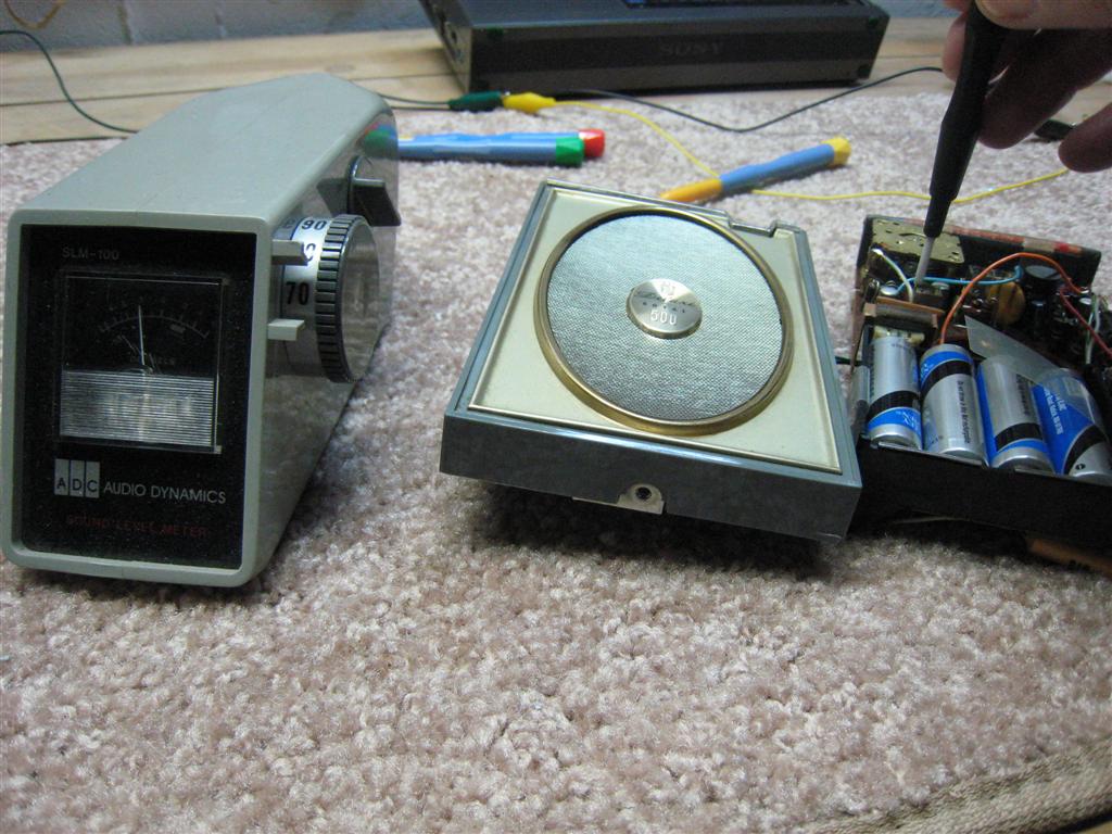Alignment: Alignment is the natural last step to any radio repair. The manuals for each model call out the specific steps, which are very few and simple in these AM-only sets. I have seen radios improve dramatically with nothing more than alignment…they can sometimes be quite far out of adjustment as found. At left I am using a sound level meter to align a 500H…this method often works better than using a direct connection to the speaker outputs which can add noise which makes low signal level measurements more difficult. The sound level meter works with no direct connection.