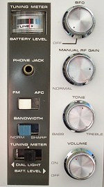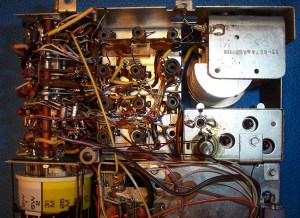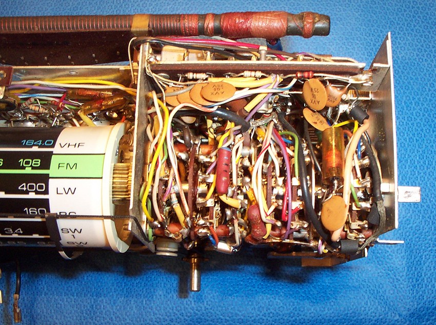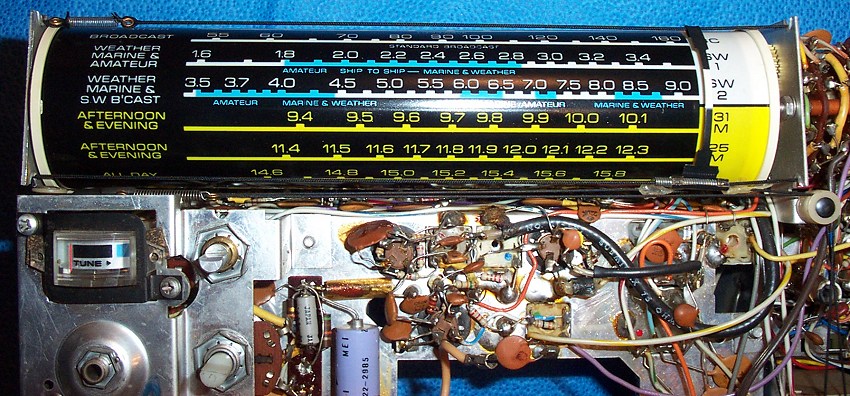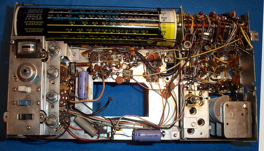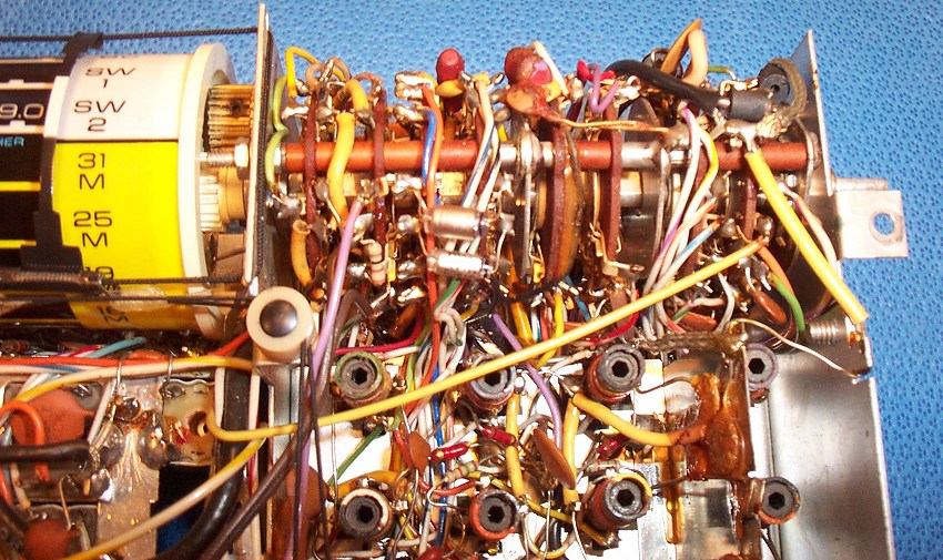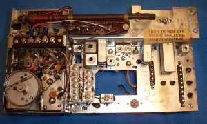 blow out the dirt and grunge, and there was a lot of black powder in there too from deteriorating foam gaskets. Otherwise the chassis looked good…no corrosion or damage was visible. At this point I used clip leads between the back panel and the chassis to hookup the speaker and power so the radio could be operated again. I found that operation was intermittent mainly due to dirty switches and contacts…even touching some of the transistors in their plug-in sockets caused loud crackling. I disconnected the power and proceeded to methodically clean them all. Special care is needed on the band selector wafer switch…some owners have told me that contact cleaner swells the phenolic wafers causing the control to bind, although they said when it dried out normal operation was restored. The contact sliders on my wafer switch were obviously dirty and worked poorly…it was necessary to clean them carefully. As with all controls, but especially in this case, when I was done I carefully cleaned away all traces of the contact cleaner using 91% isopropyl alcohol. I had no problems with the wafers and normal operation was restored. Cleaning the transistors in their plug in sockets is easy too…in fact I recommend you don’t remove them fully. You run the risk of plugging them in incorrectly, and at the least, it can be tricky to coax their leads back into the proper position. I simply lifted them out a bit of their seated position, sprayed just a small trace of contact cleaner down the leads toward the sockets, then worked them in and out, ending up with them firmly seated. Every one worked perfectly after that treatment.