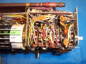 As often happens my initial reaction to seeing the unit was a bit of a disappointment. The radio looked like a formerly magnificent instrument, but it was so dirty it was hard to imagine it could ever look nice again. I don’t understand why eBay sellers don’t try to clean something like this up a bit, taking just a couple of minutes to make it look a lot better. Perhaps they are afraid to. But I had gotten this radio particularly cheaply because the seller was very honest in describing its problems. It didn’t work on all bands, the controls were intermittent and staticy, the lights didn’t work and the audio was distorted even when stations could be found. I knew I was taking a chance with this one compared to some of the more beautiful examples I saw, but as I said the price was right and I stood to learn a lot and lose only a little.